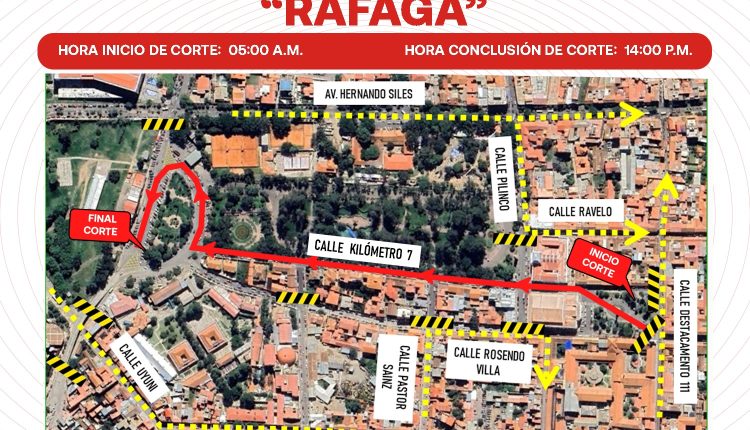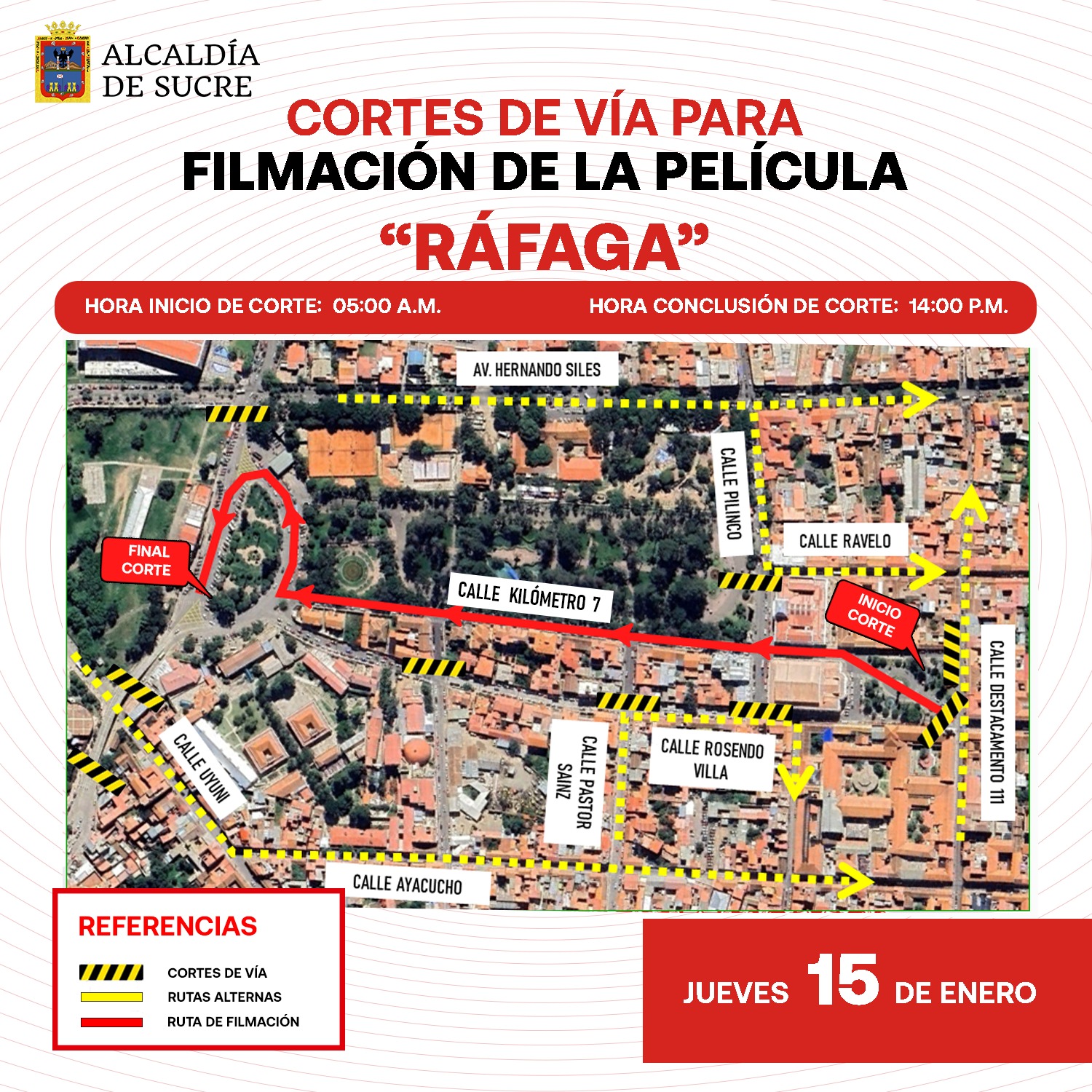 La Alcaldía de Sucre informa a la población que, con motivo de la filmación de la película “Ráfaga”, se realizarán cortes de vía este jueves 15 de enero, en la ciudad de Sucre, desde las 05:00 hasta las 14:00 horas.
