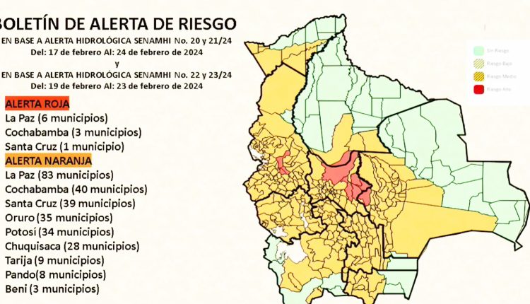 Según Calvimontes, los departamentos en alerta naranja son La Paz con 83 municipios, Cochabamba con 40, Santa Cruz con 39, Oruro con 35, Potosí con 34, Chuquisaca con 28, Tarija con 9, Pando con 8 y Beni con 3 municipios.