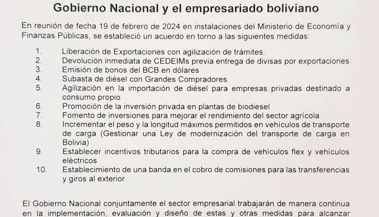 LocalNacional Gobierno y los empresarios acordaron 10 medidas para superar la escasez de dólares. By Radio Charcas Last updated Feb 19, 2024 Share Estas son las 10 medidas acordadas entre el Gobierno y los empresarios para superar la escasez de dólares. Share FacebookTwitterGoogle+ReddItWhatsAppPinterestEmail