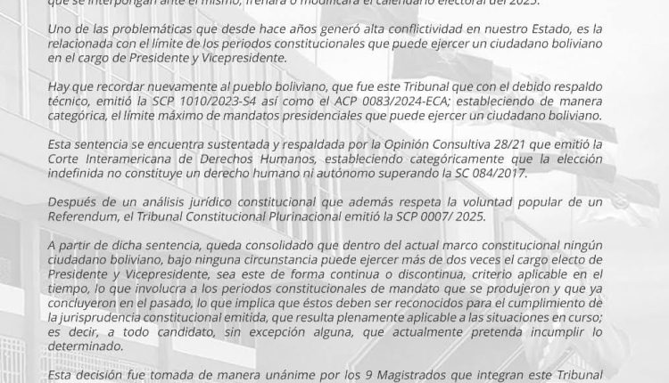 Este es el comunicado que fue leído hace minutos por el magistrado decano del Tribunal Constitucional Plurinacional (TCP), en el que se deja en claro que ningún ciudadano podrá optar a una segunda reelección presidencial de forma continua o discontinua